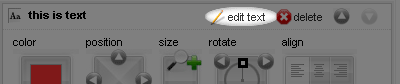 - Position: Select up/down, left/right. Or drag selected text around the design area by mouse.